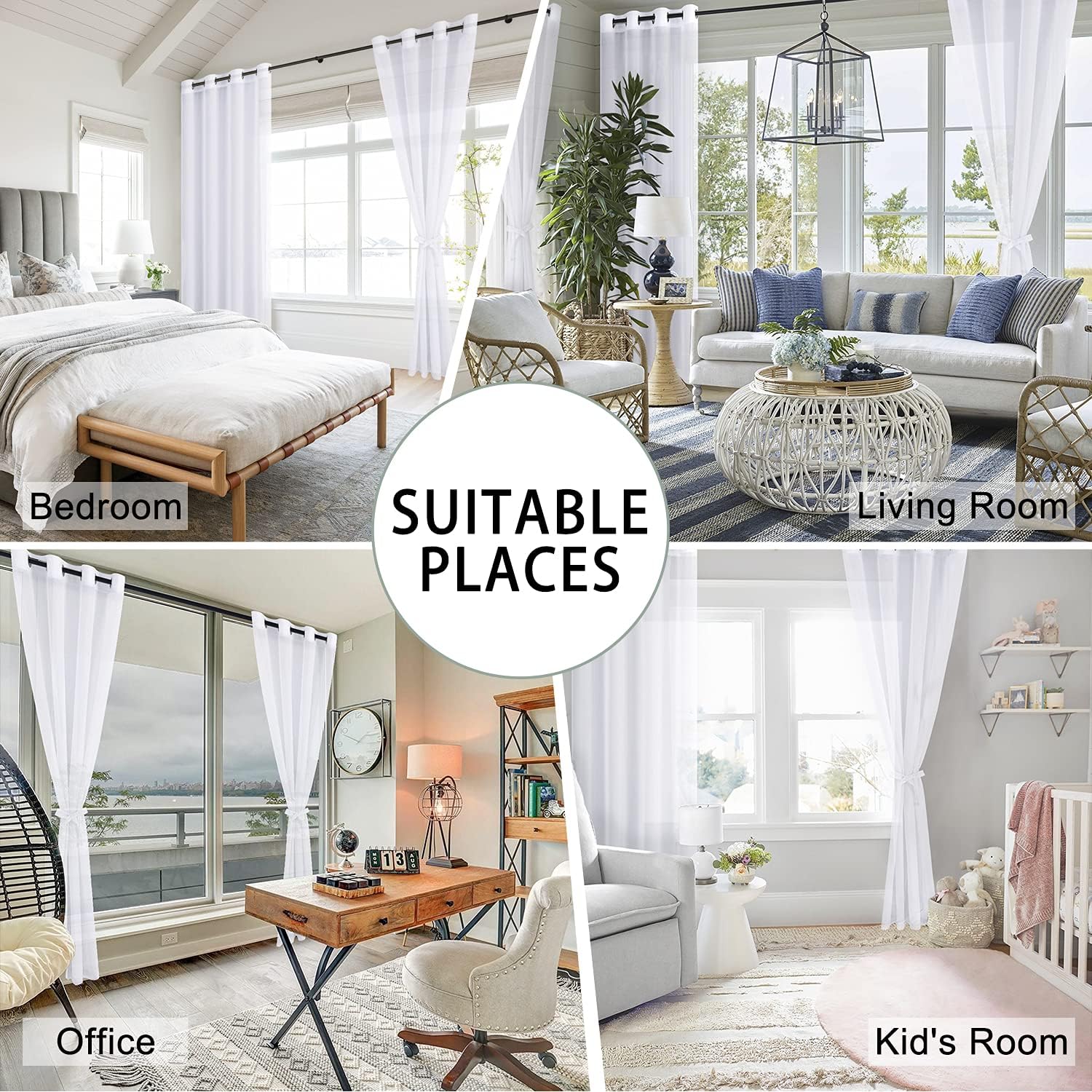 Transform your space with the Hiasan White Sheer Curtains. These elegant curtains are 84 inches long and come with tiebacks for added versatility. Made from light filtering semi-transparent lightweight voile, these grommet window curtains are perfect for creating a soft and airy ambiance in any room. Each set includes two drape panels measuring W52 x L84, making them ideal for bedrooms, living rooms, and more. Add a touch of sophistication to your home decor with these beautiful sheer curtains.