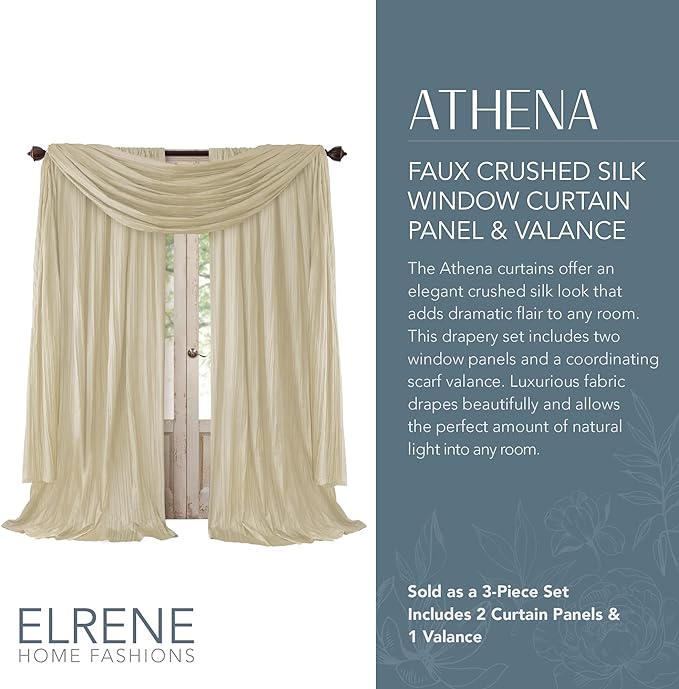 - ELEGANT CURTAIN & VALANCE SET: Whether you use it for living room, office, or bedroom window curtains, the Elrene Home Fashions Athena Faux Crushed-Silk Window Curtain Panel and Valance Set is a lovely addition to your home.